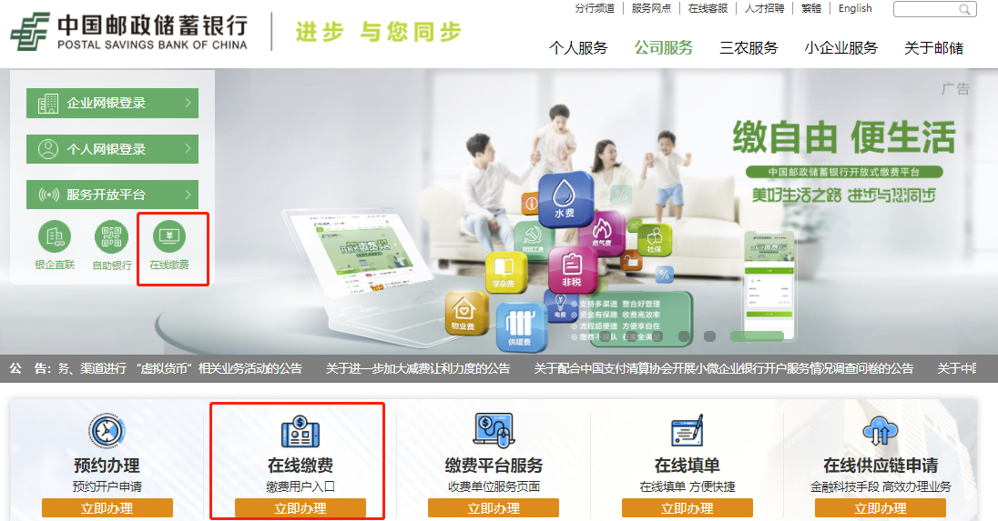 登錄繳費用戶登錄“中國郵政儲蓄銀行”官網(wǎng)(http://www.psbc.com/cn/),點擊“服務(wù)快捷通道-在線繳費”進入,無需注冊及登錄。