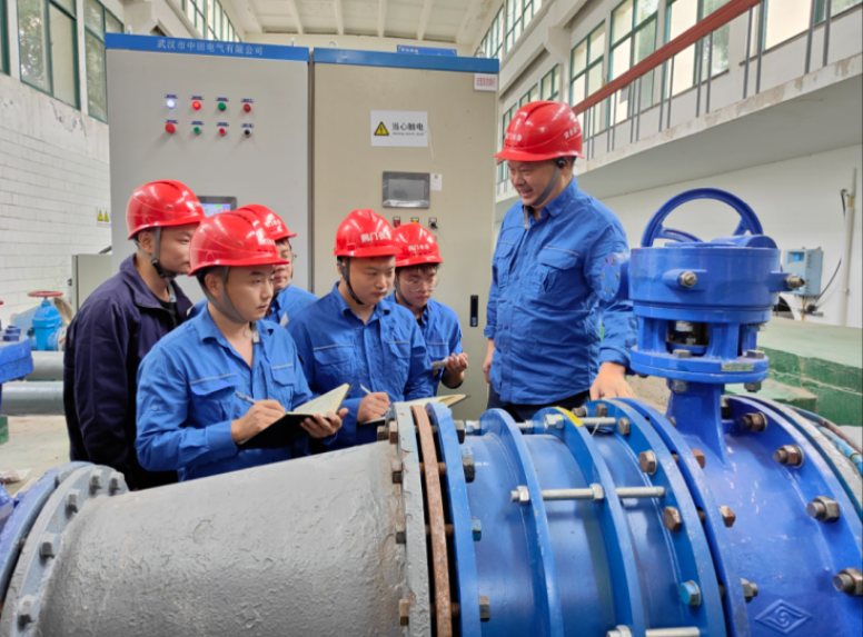 賈師傅(左一)與青年員工研究電路接駁